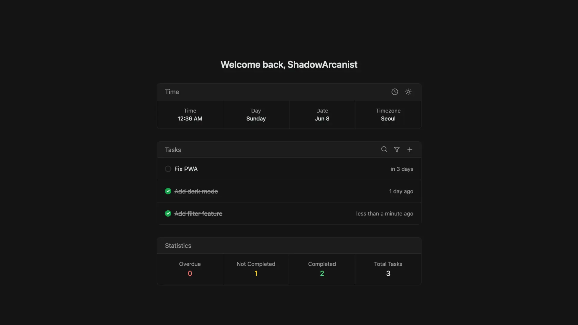 It stores all your data locally using Local Storage, so your tasks never leave your device. Everything loads almost instantly — no servers, no sync delays, no accounts. Just you and your tasks.